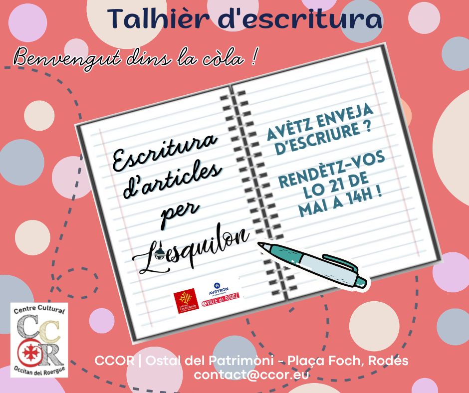 Per aprestar 𝒍’𝑬𝒔𝒒𝒖𝒊𝒍𝒐𝒏 de l’estiu, vos prepausam un 𝘁𝗮𝗹𝗵𝗶𝗲̀𝗿 𝗱’𝗲𝘀𝗰𝗿𝗶𝘁𝘂𝗿𝗮 lo dijòus 21 de mai a 14h a l’Ostal del Patrimòni. Aqueste numèro se centrarà sus Maria Roanet. Mas tot subjècte e totas fòrmas d’escritura son los planvenguts !