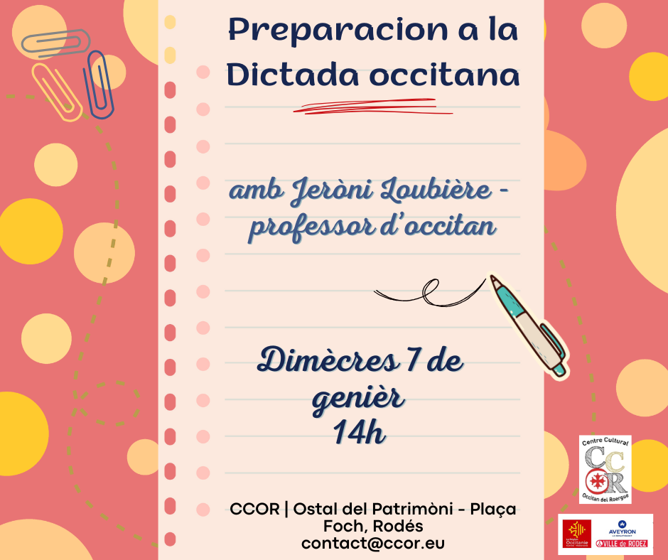 Aprèp la barradura de l’Ostal del Patrimòni per las fèstas, rendètz-vos lo 7 de genièr a 14h per un novèl talhièr de preparacion a la Dictada Occitana, totjorn animat per Jeròni Loubière.