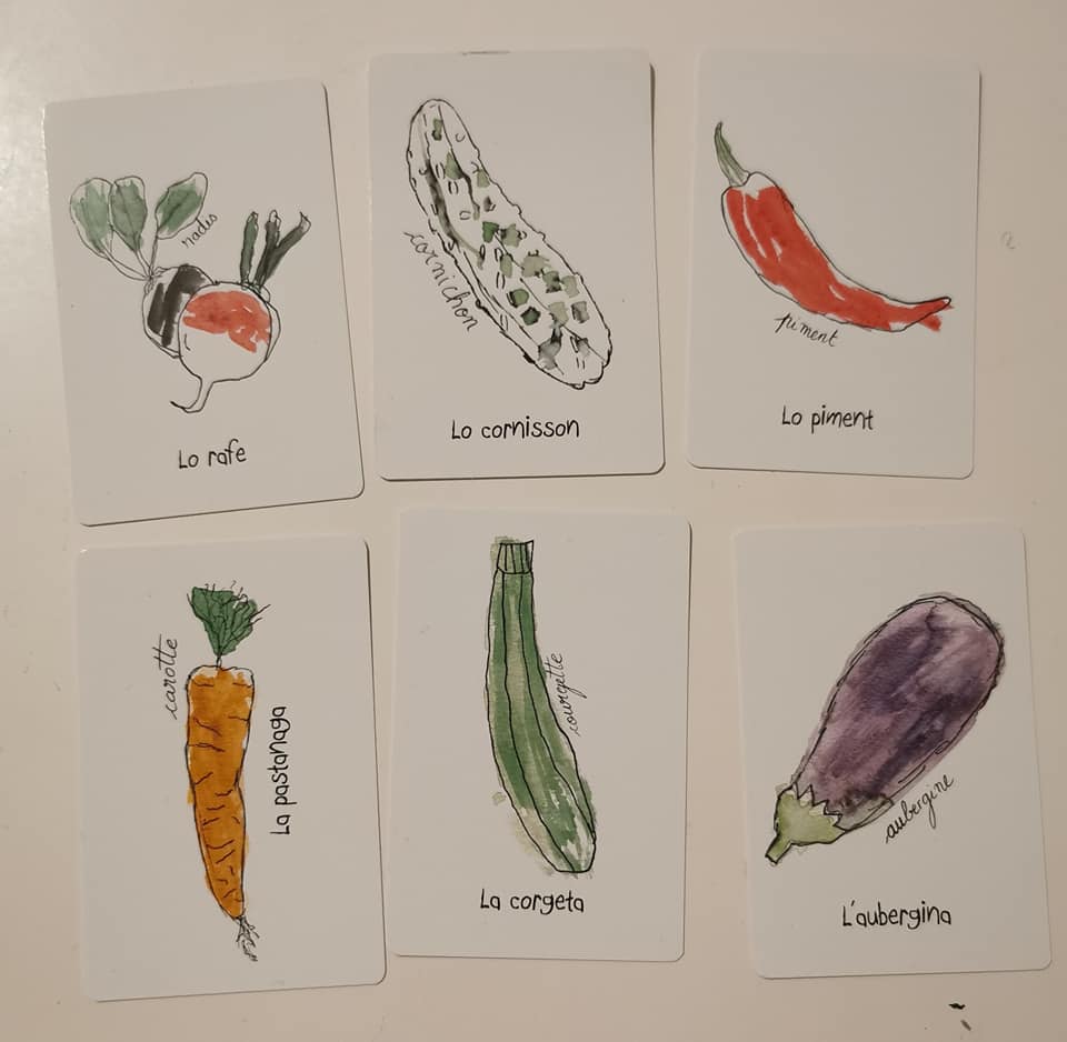 Les cartes sont illustrées, avec le mot en occitan et sa traduction en français.